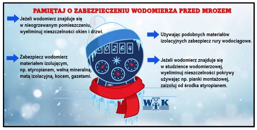 W związku z dużymi mrozami, przypominamy o obowiązku odpowiedniego zabezpieczenia wodomierza głównego i instalacji wodociągowej przed zamarznięciem. Temperatura poniżej 4 stopni Celsjusza, może uszkodzić wodomierz znajdujący się w nieogrzewanej piwnicy bądź studni wodomierzowej, w wyniku zamarznięcia wodomierza może dojść do rozszczelnienia instalacji wodociągowej, a nawet zalania pomieszczeń.Poniżej przedstawiamy kilka sposobów zabezpieczenia wodomierza przed zamarznięciem oraz […]